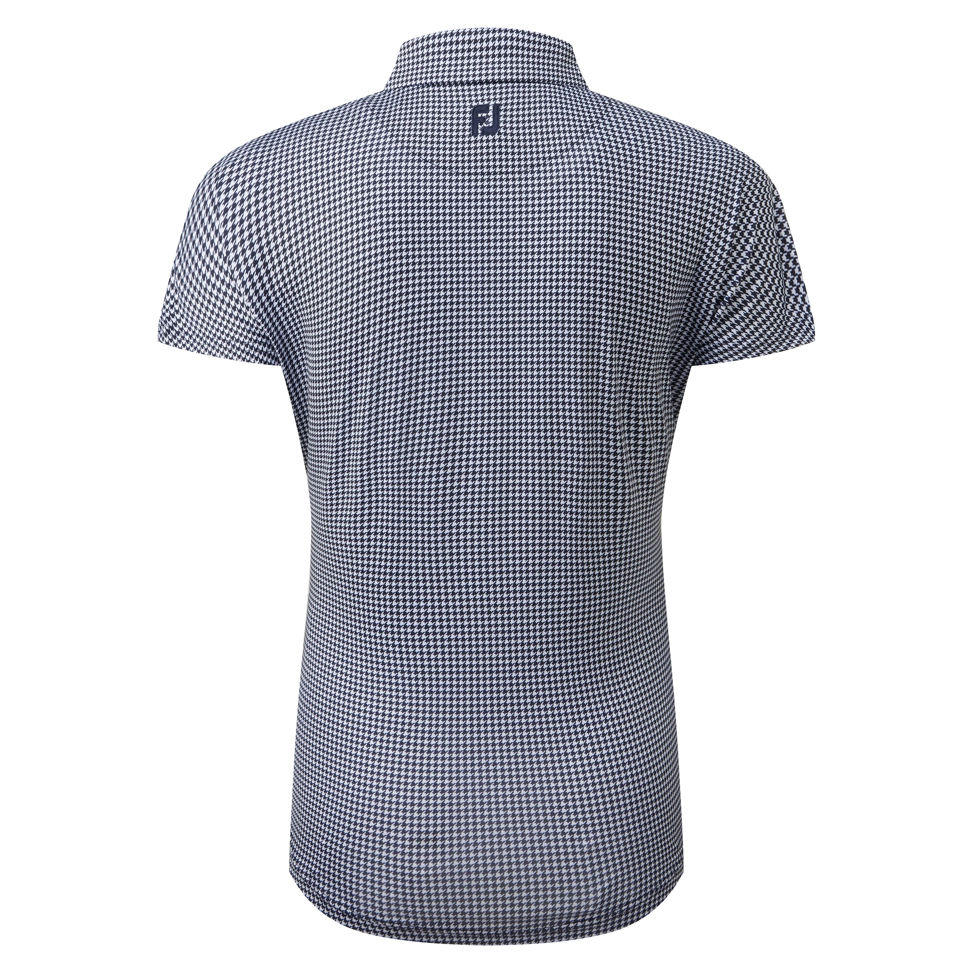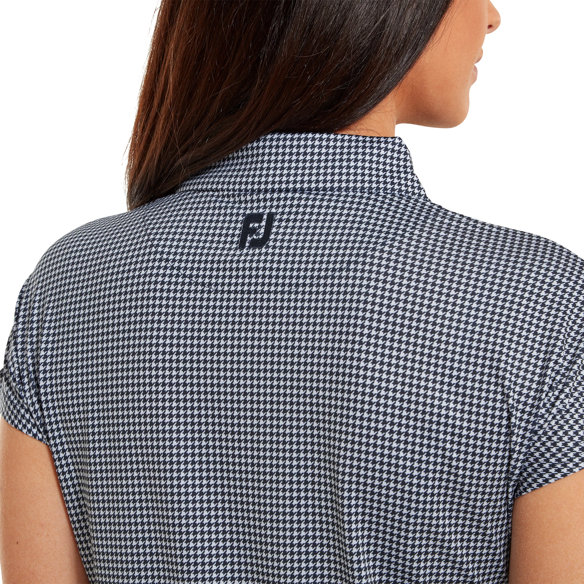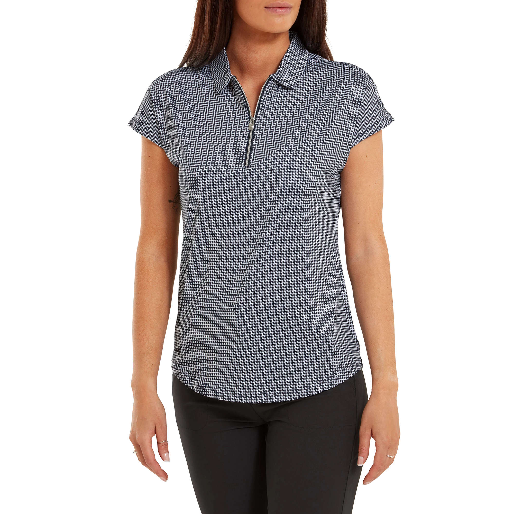 The FootJoy Ladies HTH Print Cap Sleeveless Golf Polo Shirt, boasts a front 1/4 zip and houndstooth detailing, provides golfers with a stylish and professional look. Its tightly twisted lisle thread fabric is soft and lustrous, constructed for optimal wear and easy care.