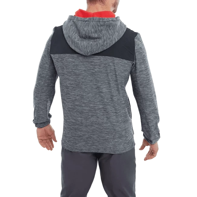 The FootJoy Thermal Golf Hoodie is designed with a stretch space dye jersey fabric that moves with your body. It’s got moisture wicking technology that pulls moisture away from the skin to keep you dry in any conditions and microfleece lined hand pockets for extra warmth.