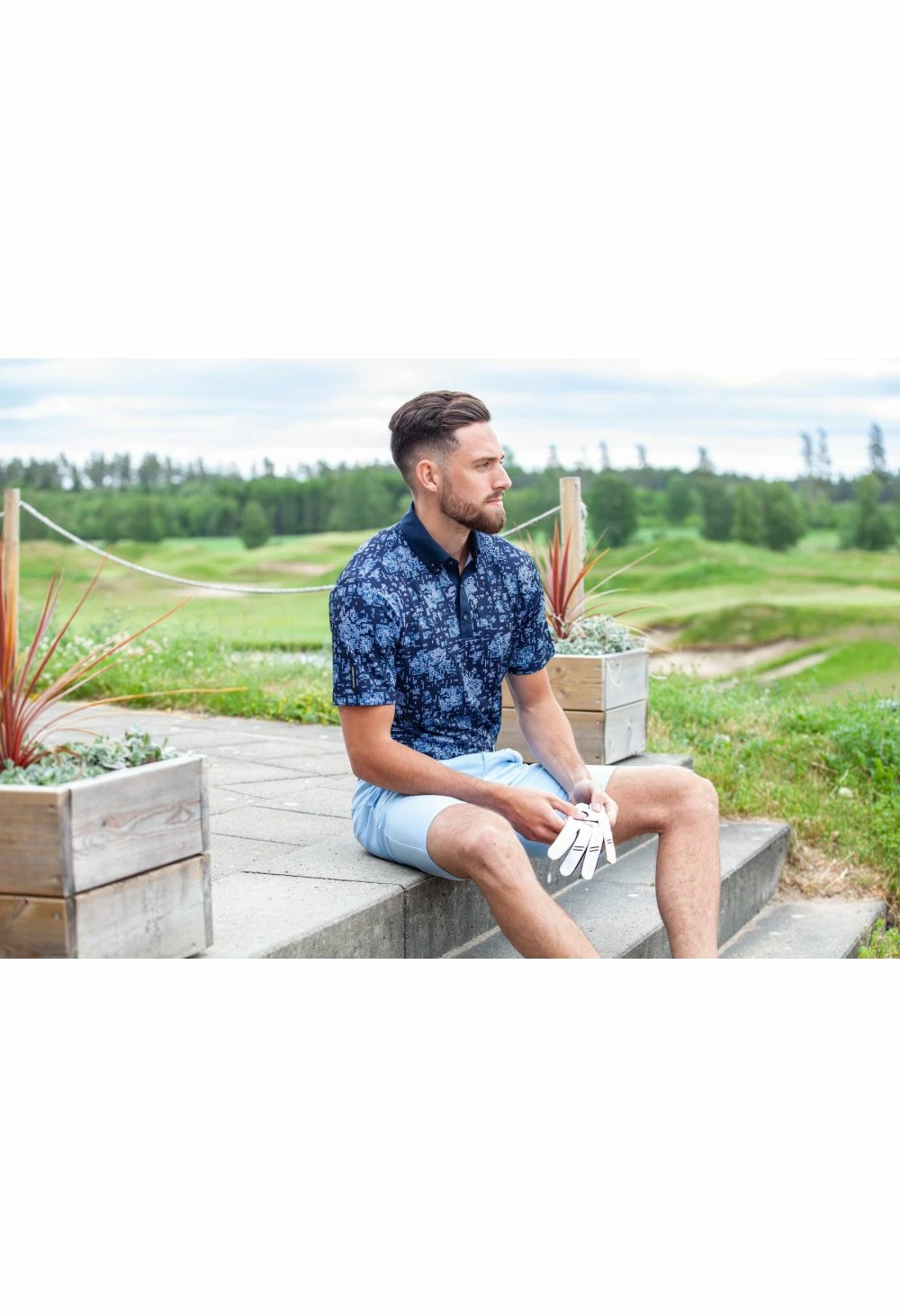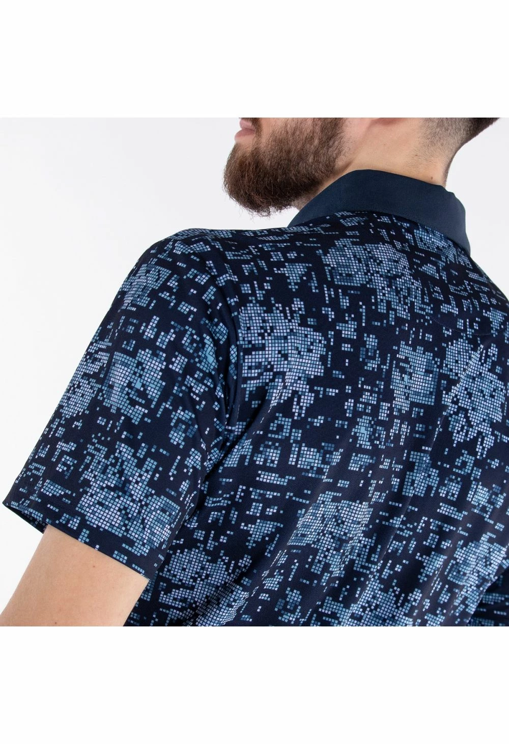 The Galvin Green Maddox V8+ Golf Shirt will give you a stylish look with comfort and top-quality performance that is perfect for the golf course. It features an all-over graphic print design inspired from pixels transformed into flowers. In contrasting shades of navy and blue bell, there is also a sewn collar and placket, open sleeve cuff and rubber logo on the left sleeve.