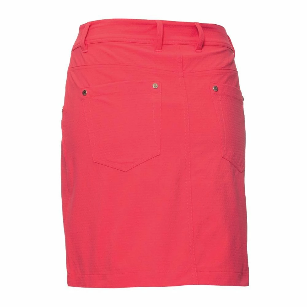 Impress on the golf course with this lovely Green Lamb Ladies Mel Spot Golf Skort with an embossed spot pattern to the eye-catching rich strawberry base. The stretchy, hidden modesty shorts will give total freedom of movement and range of motion is enhanced through the stretch fabric. The range of features include an impressive four pockets for all your golfing essentials, silver logo rivets on the pockets and a silver lurex thread Lamb logo on the right back pocket. This skort is made for maximum comfort being lightweight, breathable and moisture wicking. The Green Lamb Ladies Mel Spot Golf Skort will complement a range of pieces and quickly become your go-to item.