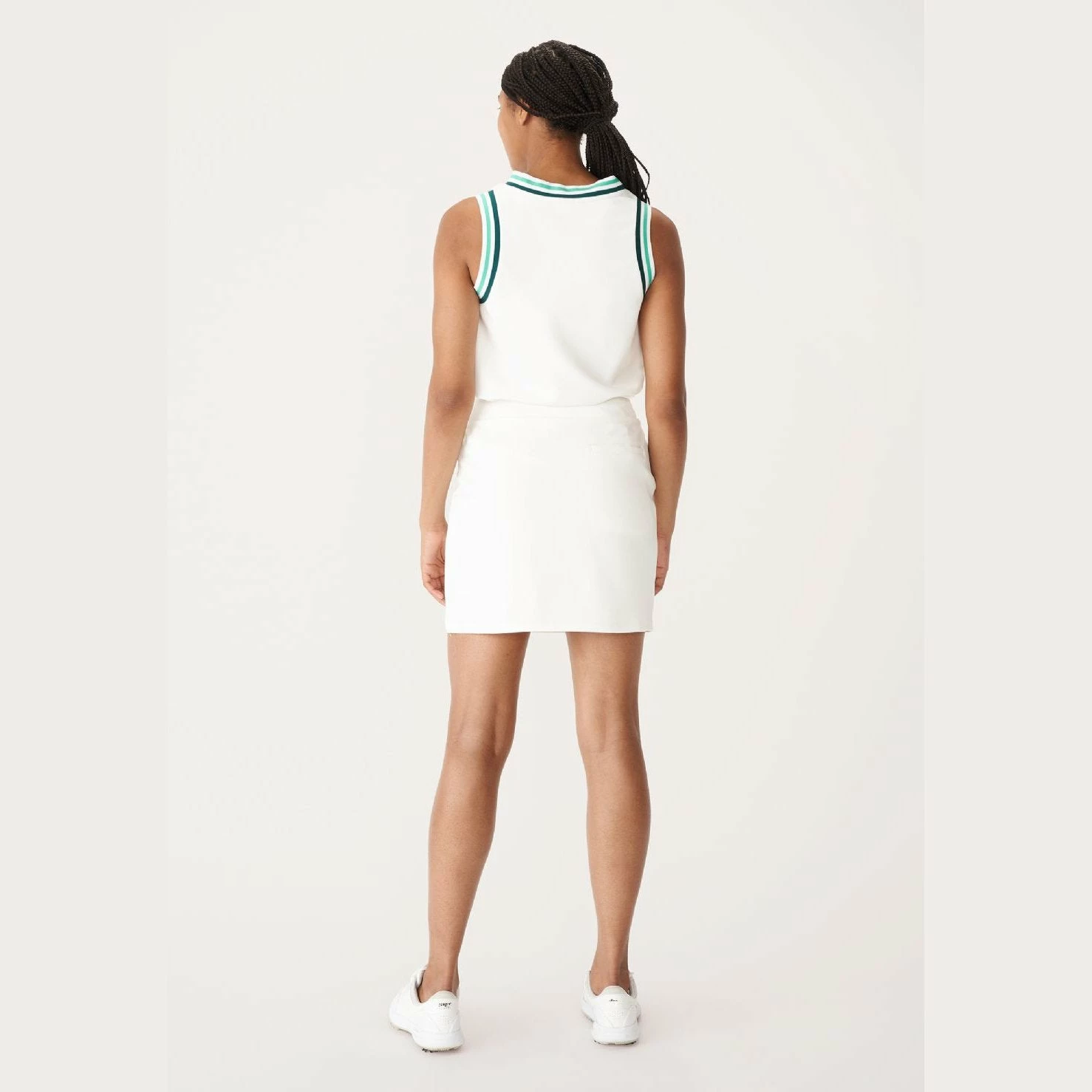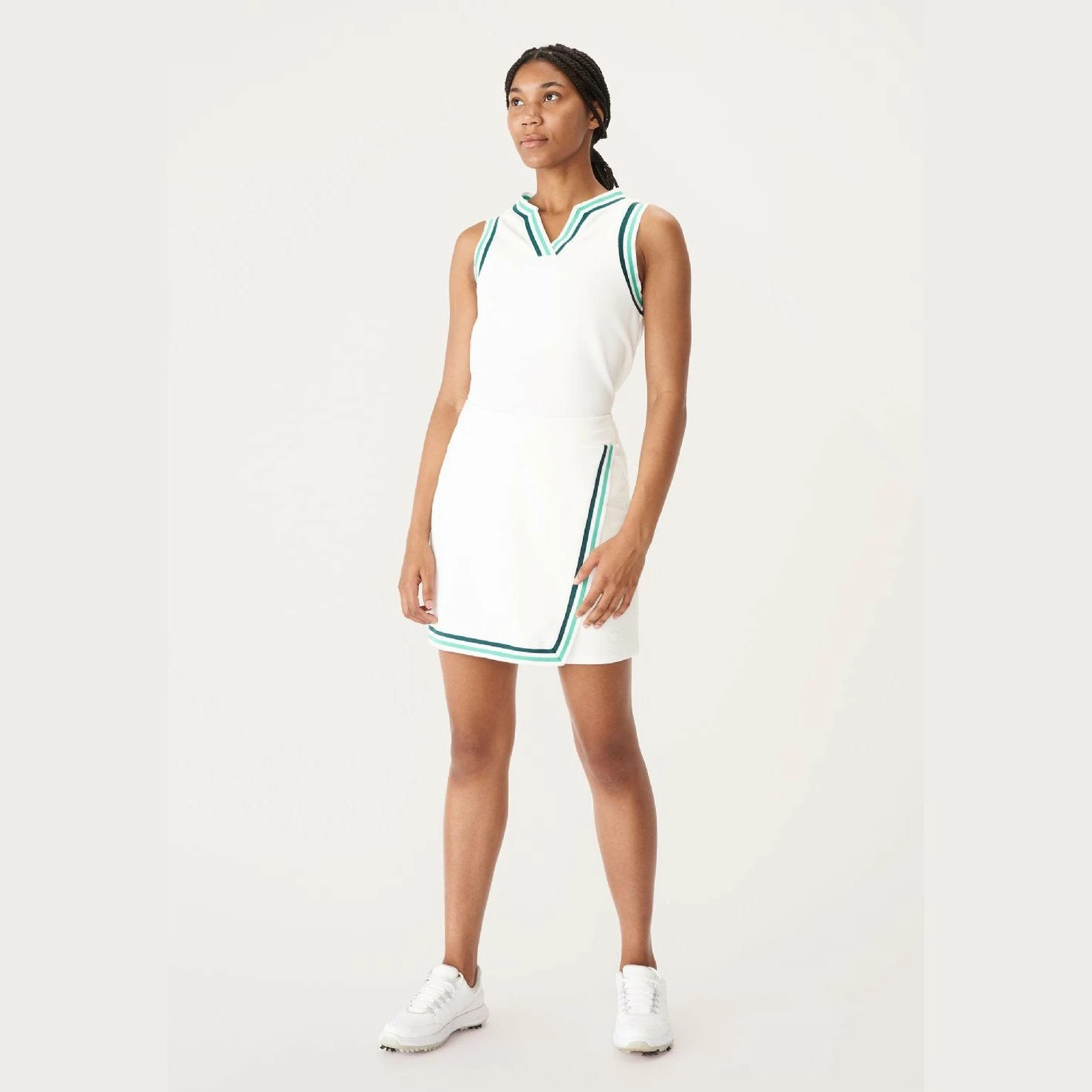 A sporty, classic retro tennis look pull on Golf skort with a beautiful textured dobby fabric. The design is enhanced with contrasting striped knit trim to the side and bottom panels.